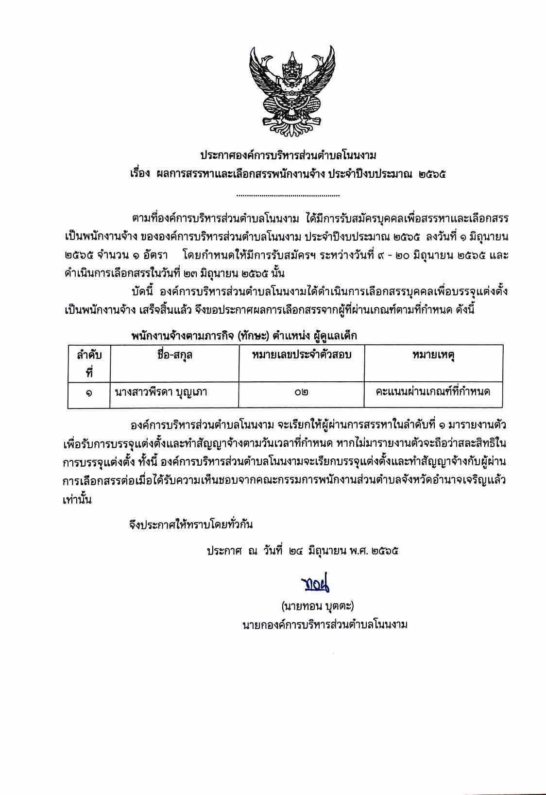ผลการสรรหาและเลือกสรรพนักงานจ้าง ประจำปีงบประมาณ 2565